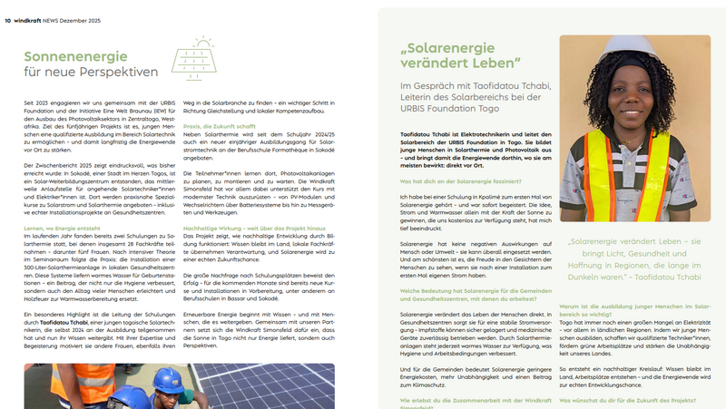 Ein besonderer Fokus der Zusammenarbeit liegt auf der lokalen Organisation und Umsetzung vor Ort. In der aktuellen Firmenausgabe der Windkraft Simonsfeld AG wurde unsere Sektorchefin für den Solarsektor, Taofidatou Tchabi, interviewt. Sie koordiniert die Ausbildungsmaßnahmen, Schulungen und Installationsprojekte in Togo und steht beispielhaft für den erfolgreichen Aufbau lokaler Fachkompetenz.